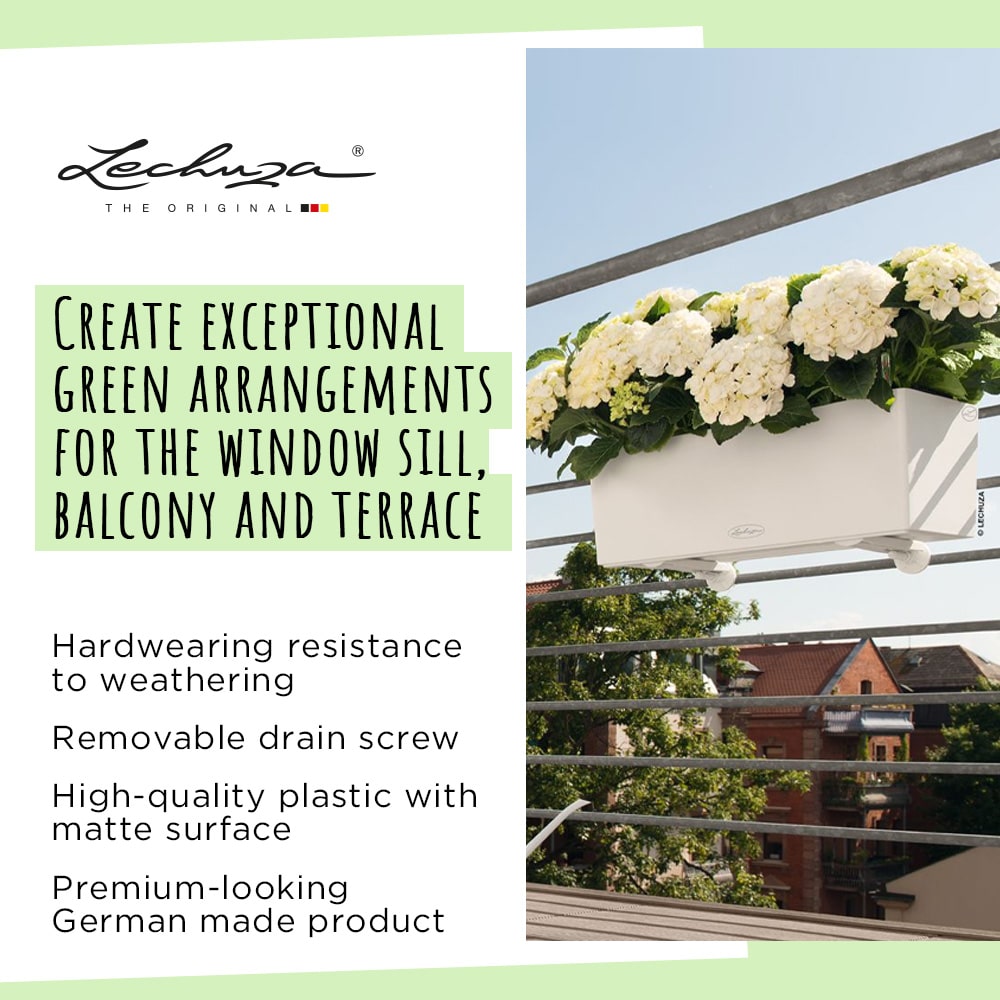 The balcony planter’s high workmanship ensures that the planter is weatherproof and can withstand wind and weather. But even in the hottest weather, the BALCONERA Color balcony planter won’t let your plants down: thanks to the integrated irrigation system with a large water reservoir, balcony plants receive sufficient liquid and are well cared for even on hot days.