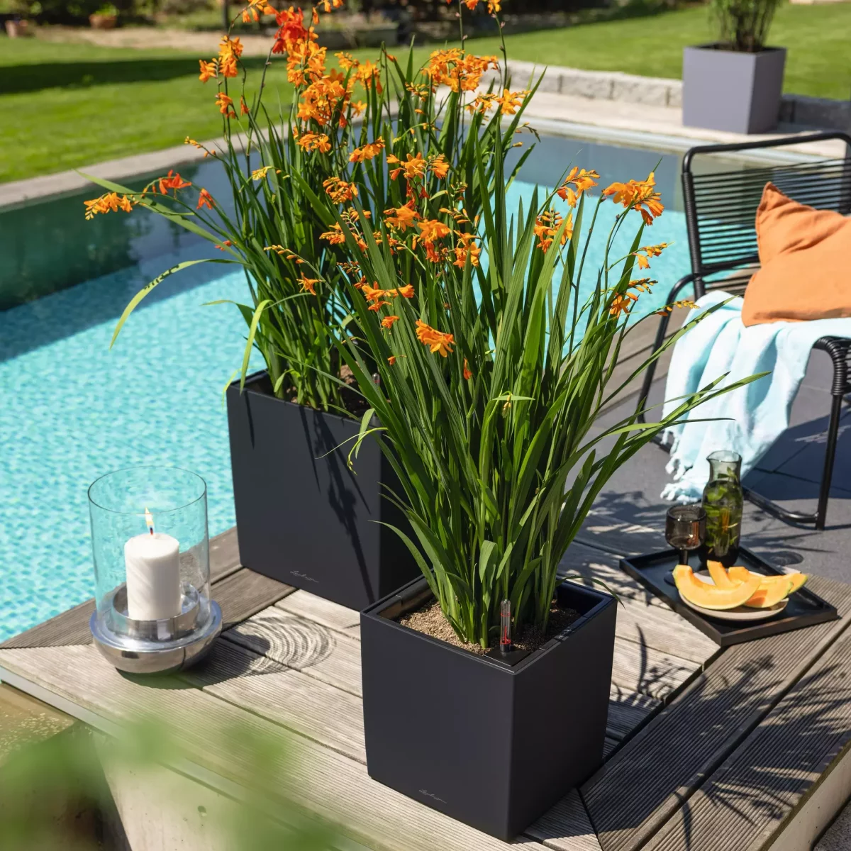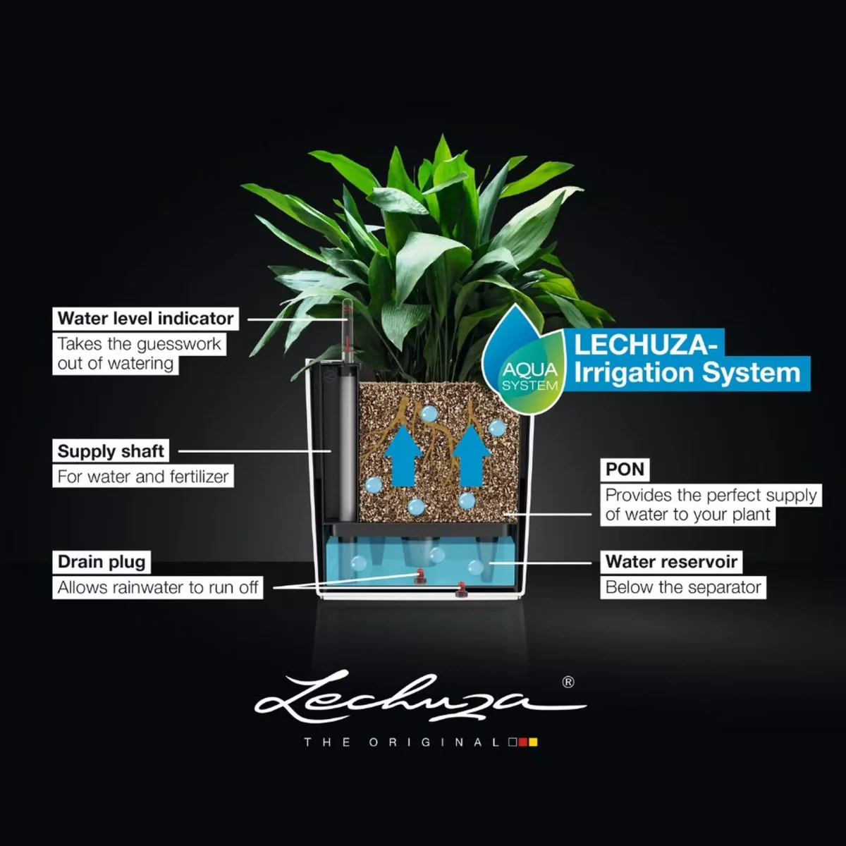 The water level indicator reliably shows you when refilling is necessary, while the generous reservoir easily bridges even hot days. The removable liner with retractable handles makes handling easier and is compatible with other LECHUZA planters. A twist-out drain plug on the underside allows excess rainwater to drain away safely and protects your plants from waterlogging.